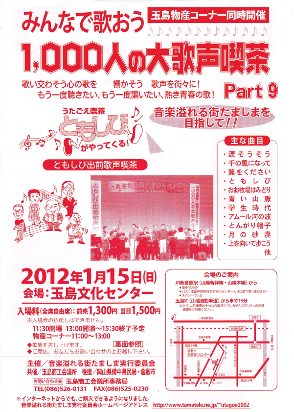 来年『1000人の大歌声喫茶part10』は平成25年1月13日(日)玉島文化センター大ホールにて